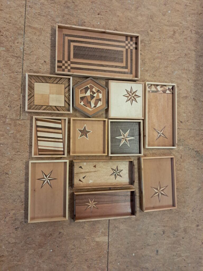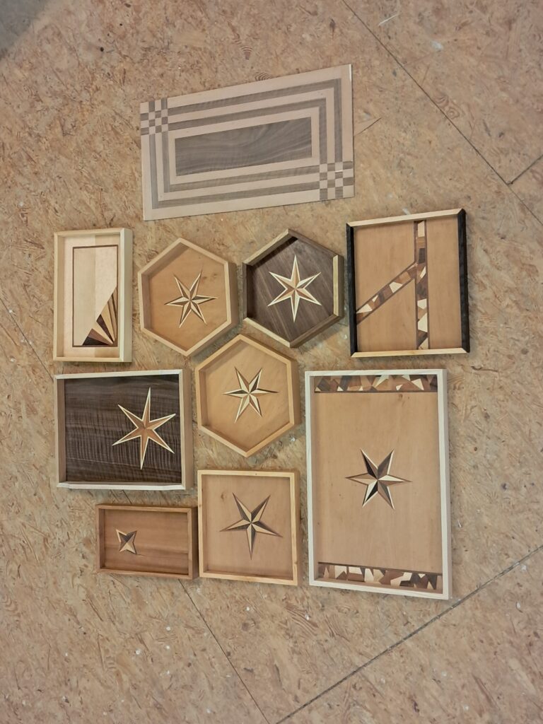Manche Teilnehmer waren gleich so ins Furnier vertieft, dass sie sich noch an ein zweites Werkstück getraut haben – gerne auch in Teamarbeit. Daher sind oben mehr als 17 Werke abgebildet, obwohl ein weiteres wegen früherer Abreise leider fehlen musste.