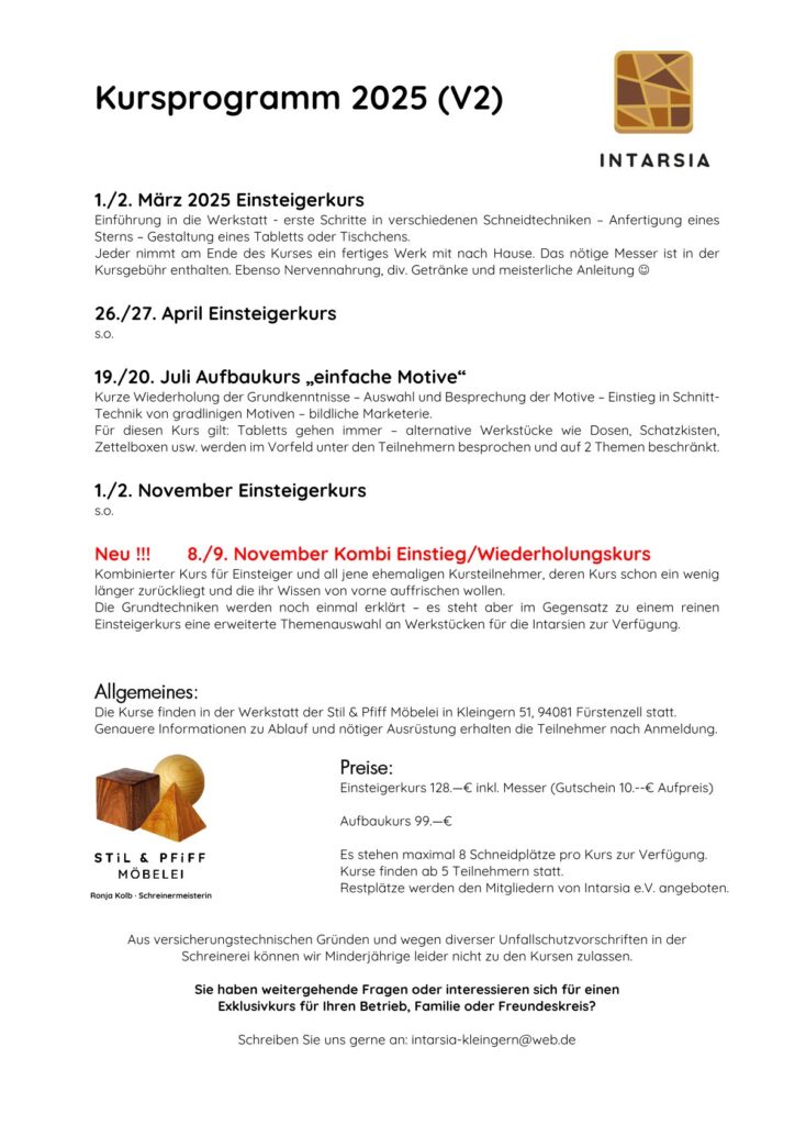 Mehrmals im Jahr veranstaltet der Verein Intarsia e.V. daher Kurse mit verschiedenen Schwerpunkten, um je nach Vorwissen die passenden Inhalte zu vermitteln.