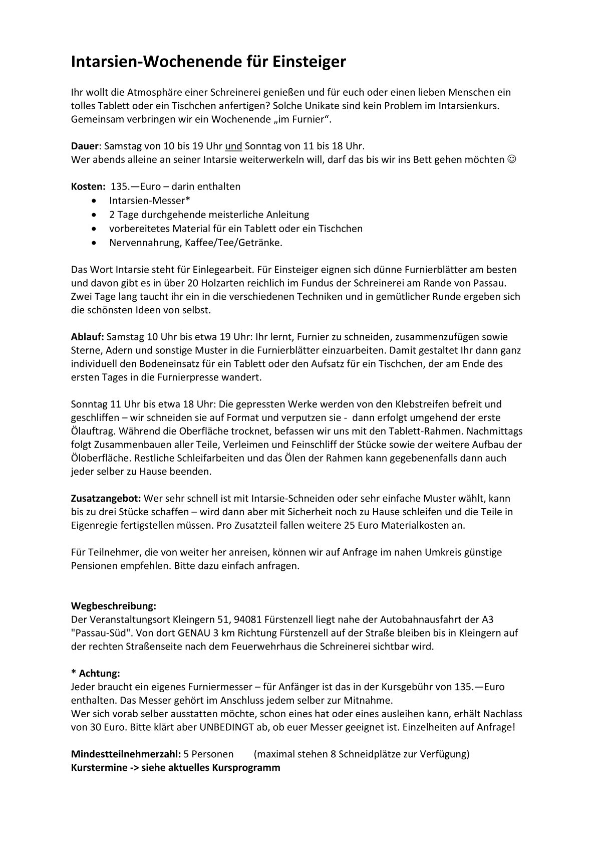 Die Kurse finden statt in den Räumen der STiL & PFiFF Möbelei (vormals Holzdesign Weranek) in Kleingern 51, 94081 Fürstenzell.
